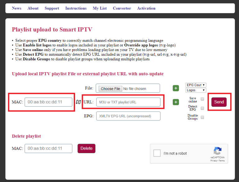 على الصفحة التي تفتح، قم بإدخال عنوان MAC الذي ظهر على شاشة التلفزيون، ثم أدخل عنوان URL الخاص بالاشتراك الذي تلقيته من مزود خدمة IPTV الخاص بك. هذا الرابط يحتوي على القنوات التي ستتمكن من مشاهدتها.